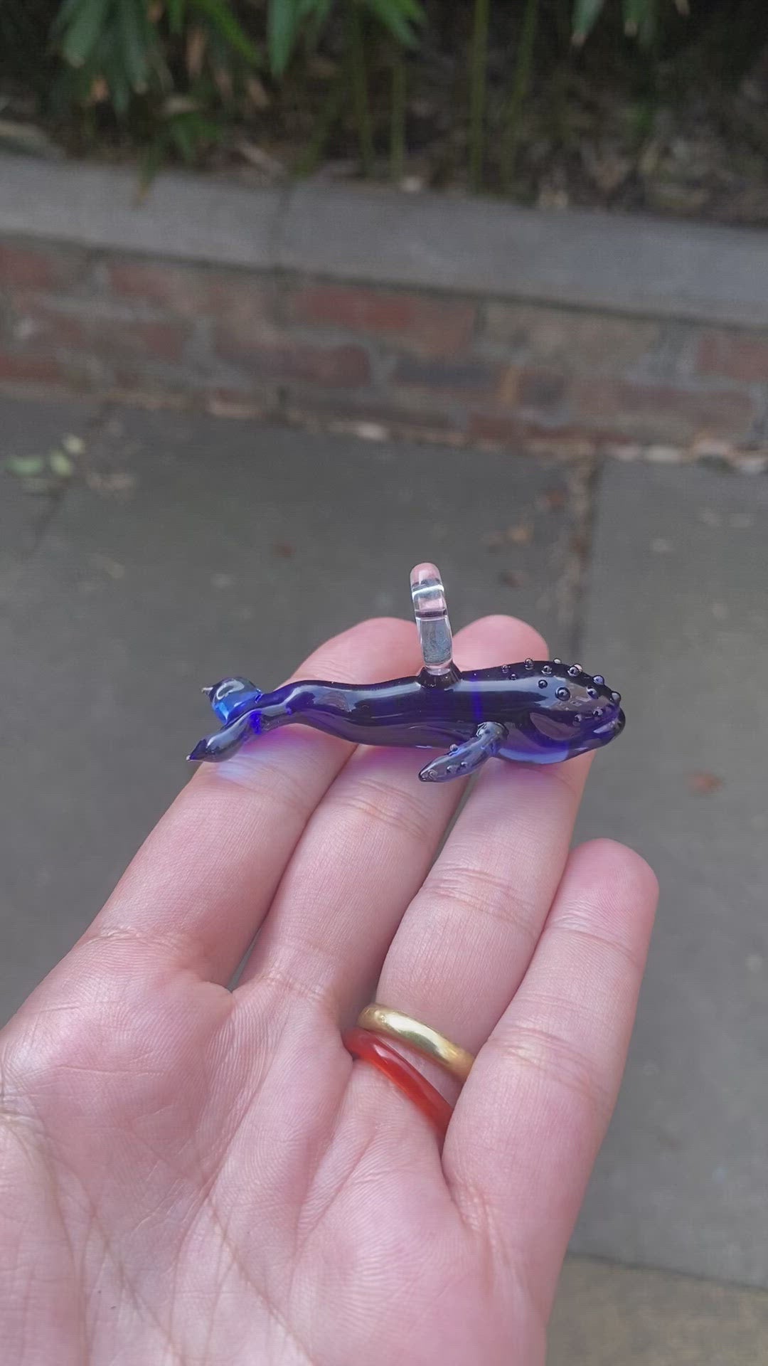 Technical Features: Whale glass pendant with gold plated chain. Lampworked borosilicate glass pendant, one of a kind. A great gift for sea lovers. The pendant was created by melting borosilicate glass rods using a torch and annealed in a digitally controlled kiln for long-lasting durability. This pendant is about 6 cm long and 2.5 cm wide.