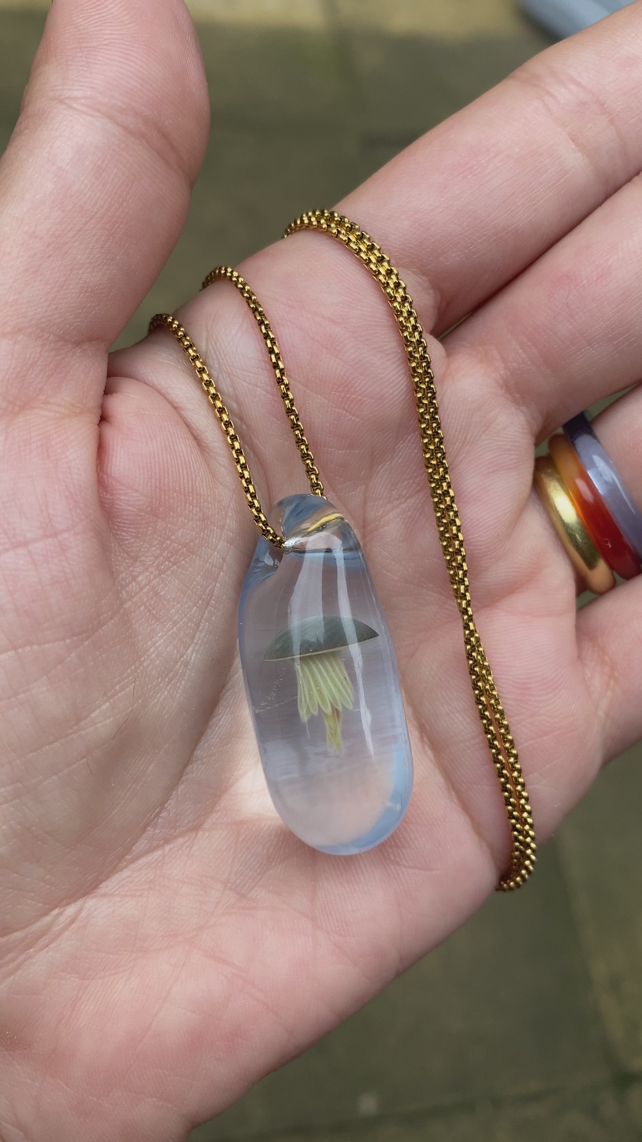 Technical Features: Jellyfish glass pendant with gold plated chain. Lampworked borosilicate glass pendant, one of a kind. A great gift for sea and jellyfish lovers. The pendant was created by melting borosilicate glass rods using a torch and annealed in a digitally controlled kiln for long-lasting durability. This pendant is about 4.5 cm (1.77 inches) long and 1.7 cm (0.67 inches) wide. There may be slight differences in appearance just like in nature!