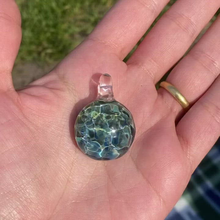 Technical Features: Lampworked borosilicate glass pendant, one of a kind. This ocen pendant necklace is about 2.5 cm (1 inch) long and 2.5 cm (1 inch) wide excluding the loop. The pendant was created by melting borosilicate glass rods using a torch, and has been annealed in a digitally controlled kiln for long lasting durability.