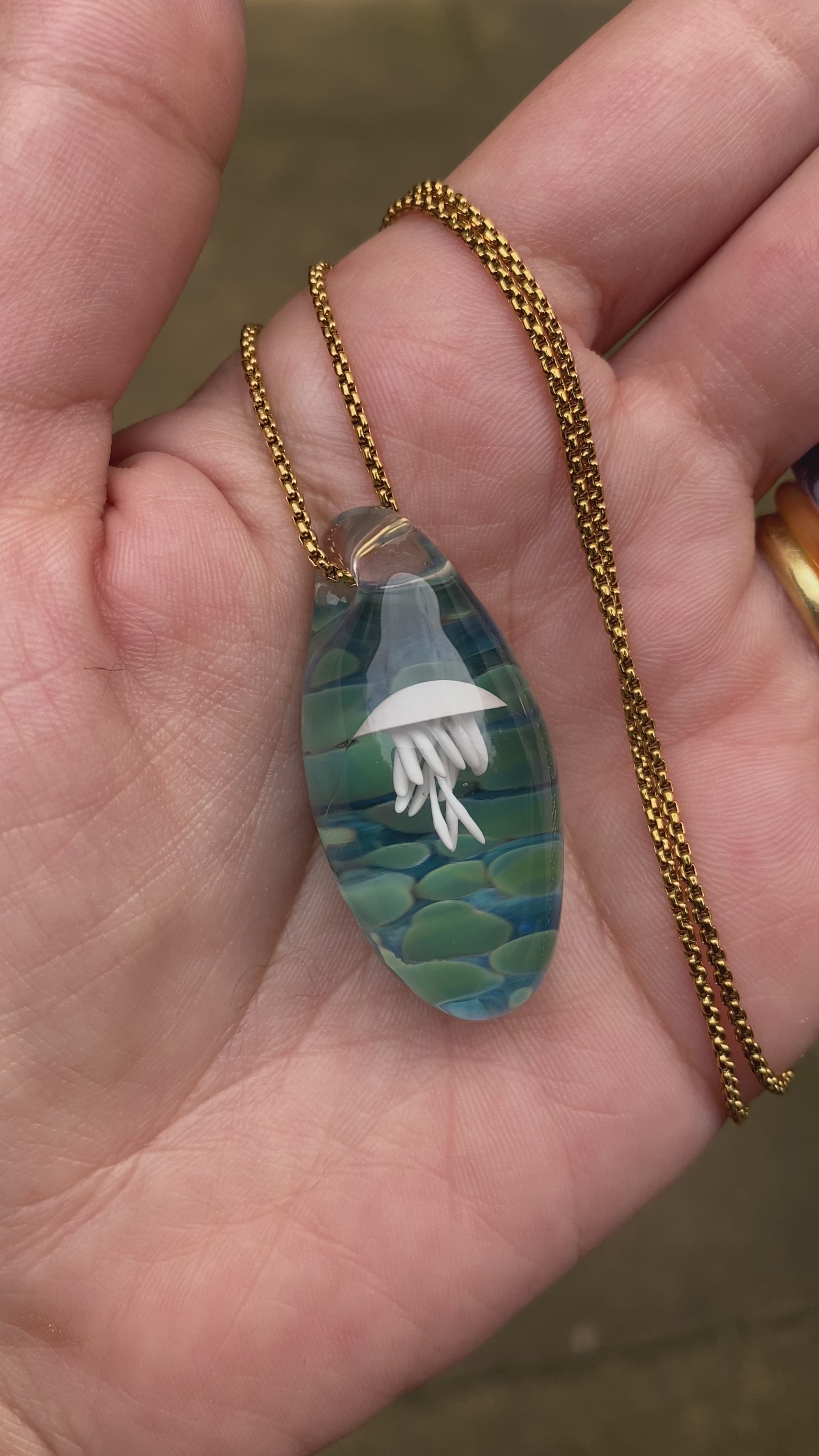Jellyfish glass pendant with gold plated chain.