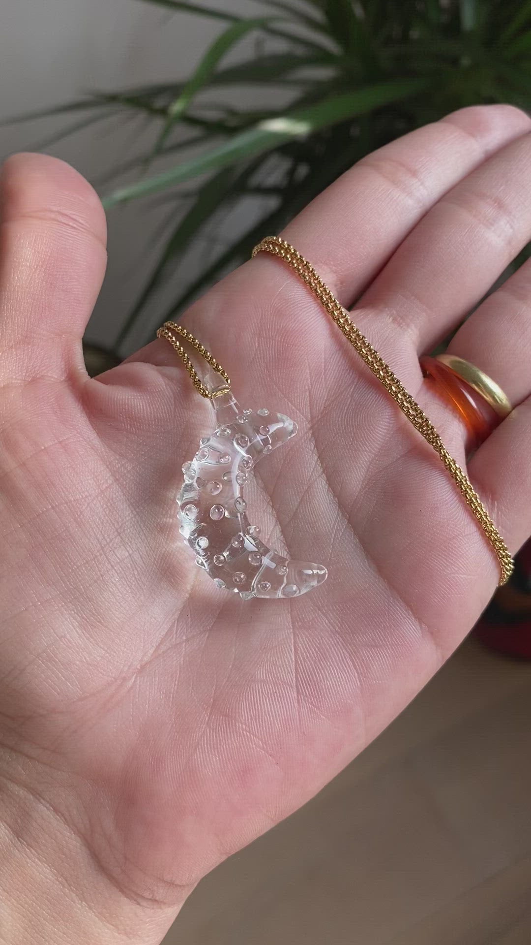 Clear Moon Pendant with 14k gold plated chain. enchanting piece features a delicately crafted glass moon. , this moon pendant necklace is the . for layering or wearing for a touch of elegance . thoughtful gift for dreamers and lovers of celestial , a touch of magic to any outfit.