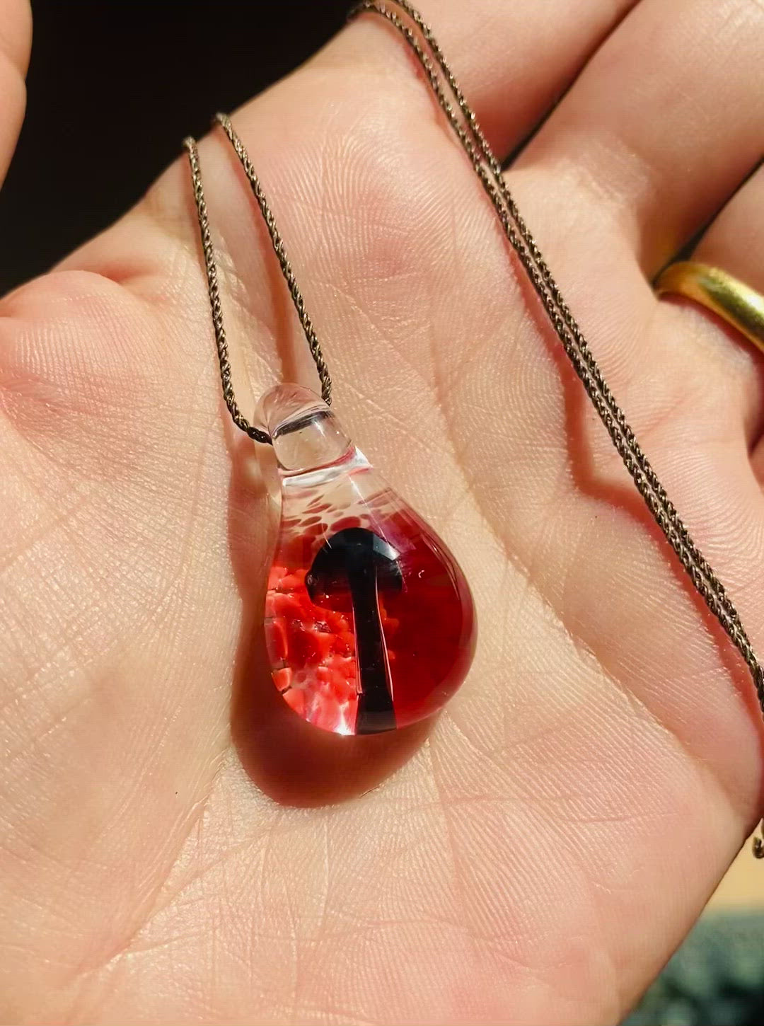 This cute blown glass pendant features a black mushroom with a red background. , this elegant black mushroom pendant necklace a . standout accessory for those who appreciate subtle, nature-inspired . , this unique piece is .