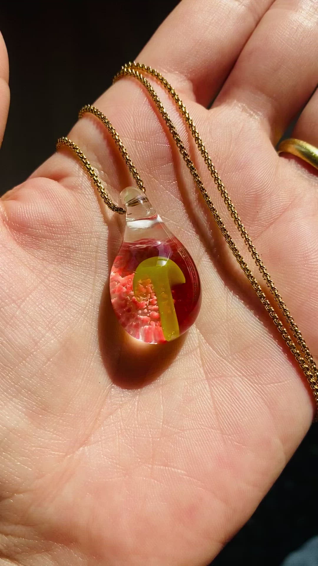Technical Features: This cute blown glass pendant features a light green mushroom with a red background. This pendant is about 3.2 cm (1.25 inches) long and 2 cm (0.8 inches) wide. Silver or gold plated chain is included. The pendant was created by melting borosilicate glass rods using a torch and annealed in a digitally controlled kiln for long-lasting durability. Due to the unique nature of this jewellery, each necklace will be slightly different. Handcrafted in the United Kingdom.