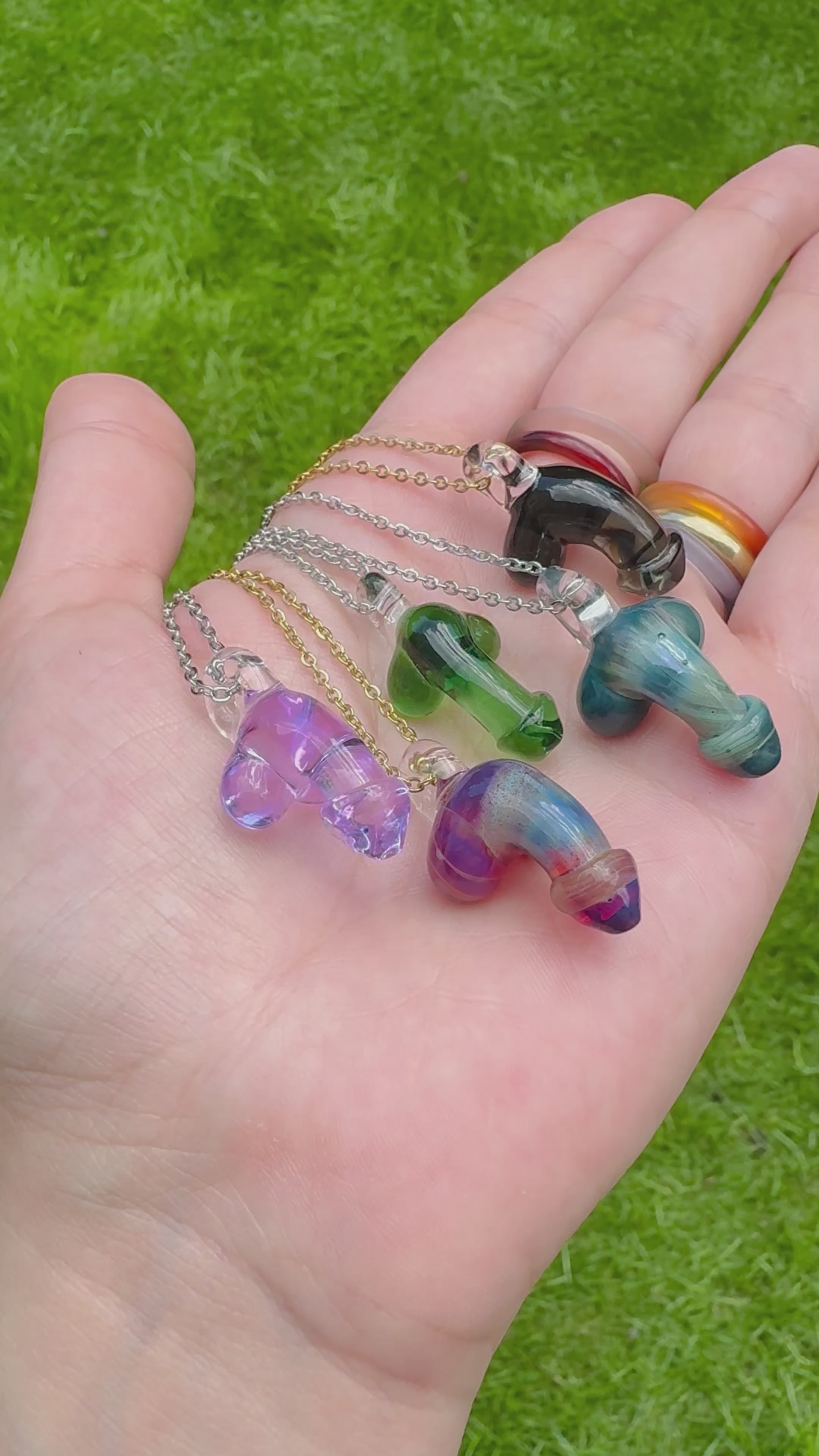 Technical Features: Penis shaped glass charms. All the pendants are created by melting borosilicate glass rods using a torch and annealed in a digitally controlled kiln for long-lasting durability. Due to the unique nature of this jewellery, each necklace will be slightly different. All chains are 45cm/18 inches and nikel free stainless steel.